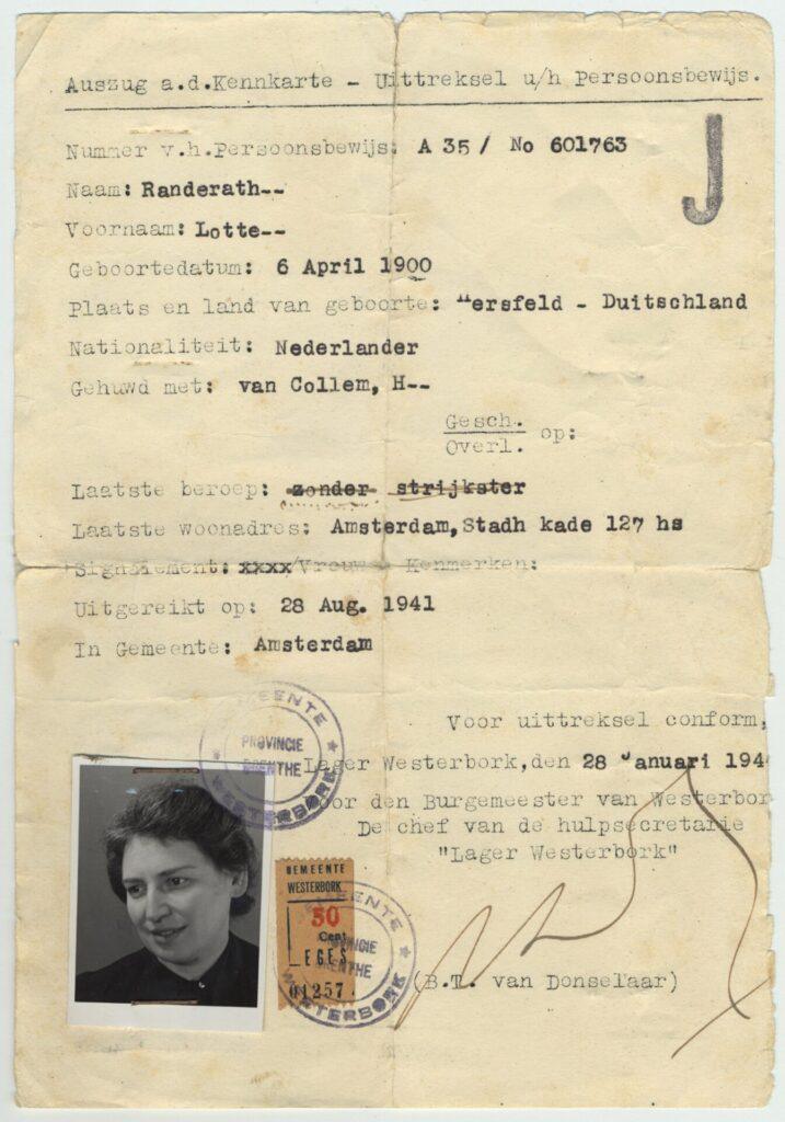 Cette carte d’identification appartient à Lotte van Collem, la mère de Ilse. Après avoir été transférés au camp de concentration de Bergen-Belsen, Lotte et deux autres de ses enfants sont embarqués le 9 avril 1945 dans un train. Les trois ne savent pas où elles se rendent, mais heureusement, le train est arrêté par l’Armée rouge qui libère les passagers (Musée de l’Holocauste Montréal).
